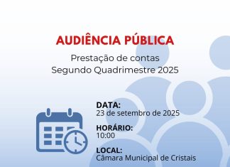 A Câmara Municipal de Cristais convida toda a população para participar da Audiência Pública de Prestação de Contas do 2º Quadrimestre de 2025.